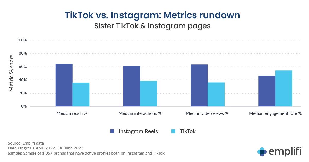 TikTok user growth is continuing to soar. Emplifi’s data revealed that the average brand saw a five-fold increase in TikTok followers in Q2 2023. While its ability to gain new users is impressive, Instagram Reels is still outperforming TikTok content when comparing median reach, median interactions, and median video views. Meanwhile, TikTok wins in terms of median engagement rates when compared to Instagram Reels