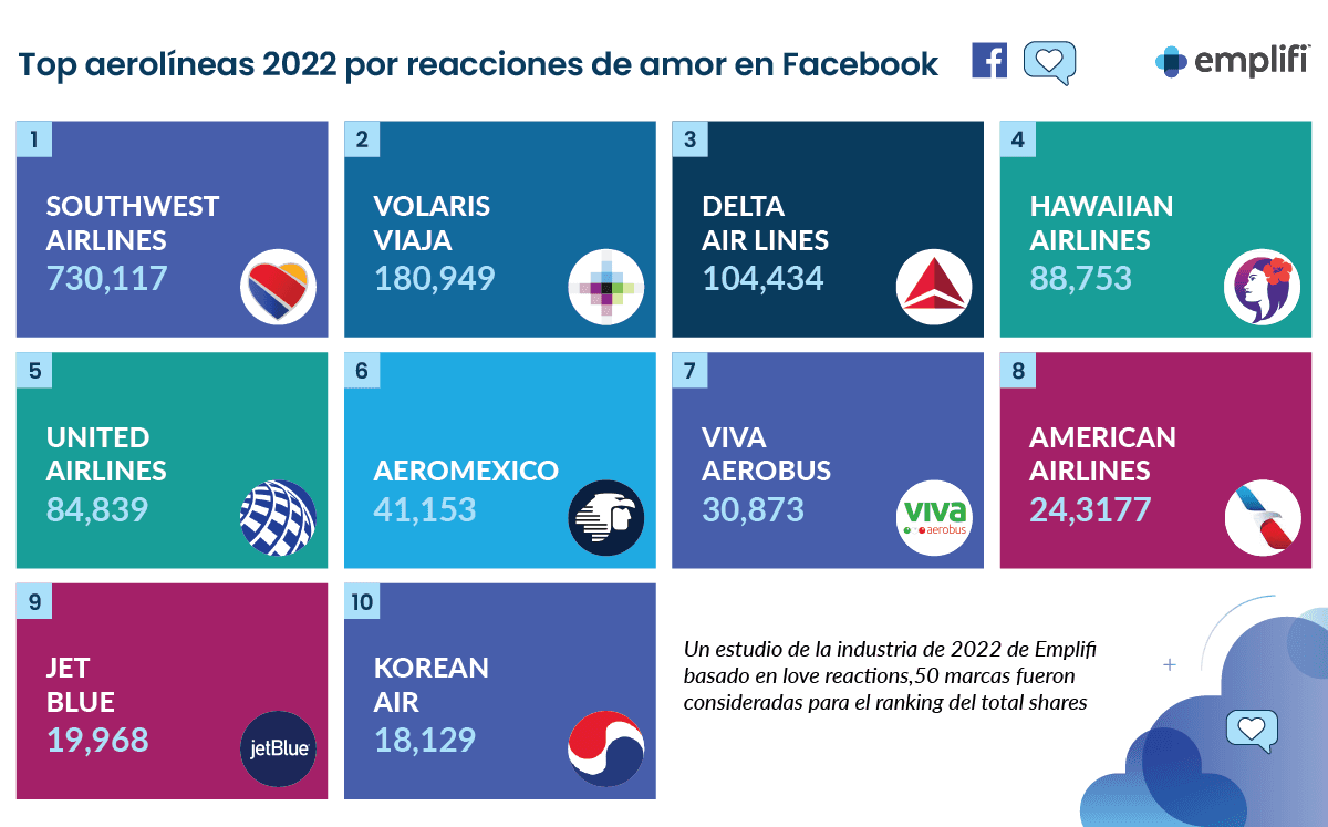 Además, su optimización de los workflows de gestión de contenido los llevó a convertirse en la segunda marca de aerolínea más popular en México y Estados Unidos. en 2022, de acuerdo a data de Emplifi que analizan la cantidad total de shares y love reactions que reciben en Facebook. Esto también es relevante ya que la aerolínea es la aerolínea latinoamericana que opera más rutas en los Estados Unidos.